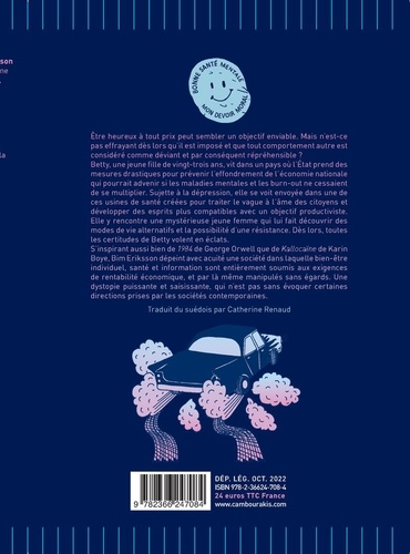 Etre heureux à tout prix peut sembler un objectif enviable. Mais n'est-ce pas effrayant dès Lors qu'il est imposé et que tout comportement autre est considéré comme déviant et par conséquent répréhensible ? Betty, une jeune fille de vingt-trois ans, vit dans un pays où l'Etat prend des mesures drastiques pour prévenir l'effondrement de l'économie nationale qui pourrait advenir si les maladies mentales et les burn-out ne cessaient de se multiplier. Sujette à la dépression, elle se voit envoyée dans une de ces usines de santé créées pour traiter te vague à rame des citoyens et développer des esprits plus compatibles avec un objectif productiviste. Elle y rencontre une mystérieuse jeune femme qui lui fait découvrir des modes de vie alternatifs et la possibilité d'une résistance. Dès lors, toutes les certitudes de Betty volent en éclats. S'inspirant aussi bien de 1984 de George Orwell que de Kallocaïne de Karin Boye, Bim Eriksson dépeint avec acuité une société dans laquelle bien-être individuel, santé et information sont entièrement soumis aux exigences de rentabilité économique, et par là même manipulés sans égards. Une dystopie puissante et saisissante, qui n'est pas sans évoquer certaines directions prises par les sociétés contemporaines.