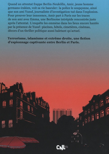 Terrorisme, islamisme et extrême droite, une fiction d'espionnage captivante entre Berlin et Paris. Amir, jeune homme d'origine germano-irakienne, se retrouve dans le viseur de la police après un attentat apparemment islamiste à Berlin-Neukölln, au cours duquel son ami Yusuf, journaliste d'investigation, a trouvé la mort. La police soupçonne Yusuf d'être l'auteur de l'attentat. Pour prouver son innocence et celle de Yusuf, Amir part avec Emma, une Berlinoise, pour Paris, dernière ville de résidence de Yusuf, où ce dernier enquêtait sur un complot international d'extrême droite. Située entre Paris et Berlin, la bande dessinée de Bianca Schaalburg nous entraîne à travers des piscines, des hôtels, des cimetières et des cinémas, dans une intrigue politique haletante.