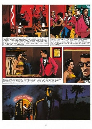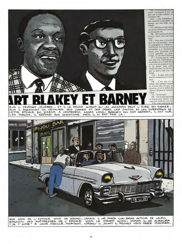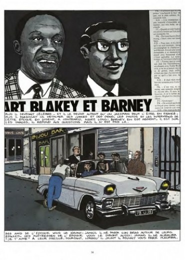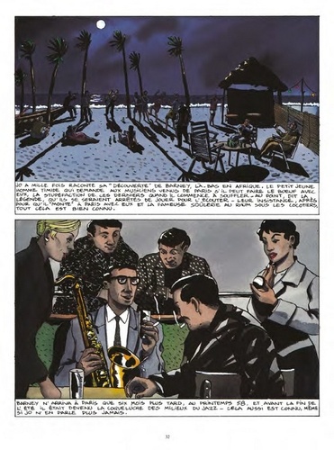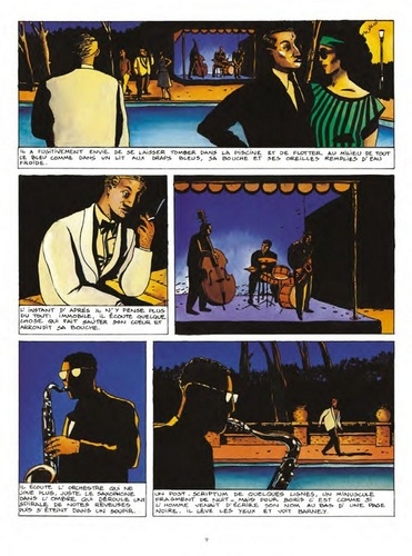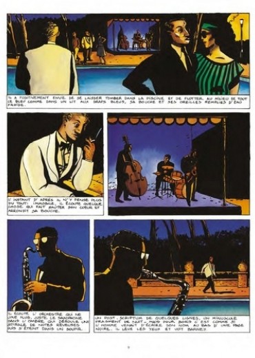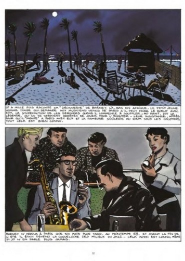 Barney et la note bleue, c'est une partition jouée à merveille par le duo Loustal & Paringaux. Deux voix qui se répondent et s'épousent pour mieux rendre les nuits bleues dans les villas de la côte d'Azur, la lumière clignotante des néons dans les chambres d'hôtel, la mélancolie et l'amertume noyées dans l'alcool et la fumée de cigarette. Deux voix qui accompagnent le parcours fulgurant, chaotique bien sûr, du premier jazzman français de renommée internationale. Car c'est lui le saxo ténor qui accompagne, à 20 ans à peine, Miles Davies sur la musique mythique du film Ascenseur pour l'échafaud. Lui aussi qui rejoint le quintette de Thelonious Monk en 1959 et enregistre en 1960 aux côté d'Art Blakey la BO des Liaisons dangereuses de Vadim. Lui le meilleur interprète de Besame Mucho. L'album est un hommage romancé, flamboyant, à Barney Wilen et à la figure de l'artiste en général : les femmes et les paradis artificiels qui désorientent, le désir d'absolu qui consume tout.