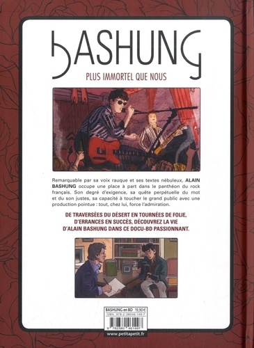 Remarquable par sa voix rauque et ses textes nébuleux, Alain Bashung occupe une place à part dans le panthéon du rock français. De son vivant paraissent 14 albums studios - il faut attendre le deuxième disque et son mythique "Gaby oh Gaby" (1980) pour que le phénomène Bashung embrase les ondes et ne les lâche plus depuis. Qu'on plane dans les Vertiges de l'Amour, qu'on Ose avec Joséphine ou qu'on Mente la Nuit, la musique de Bashung continue de bercer nos vies. A égalité avec Matthieu Chedid, il est le chanteur le plus primé aux Victoires de la musique. Alain Bashung restera, pour toujours, plus immortel que nous. De traversées du désert aux tournées de folies, d'errances en succès, découvrez la vie d'Alain Bashung dans ce Docu-BD passionnant.