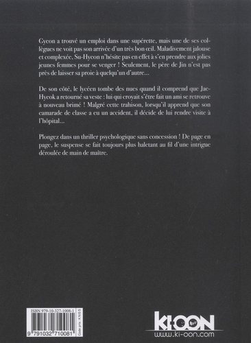 Mon père est un tueur... et je suis son complice. Autour du lycée de Jin, les disparitions de femmes se multiplient... Le jeune garc ? on vit pourtant dans un quartier huppé grâce à la réussite de son père, P. -D. G. d'une grande entreprise. On pourrait croire qu'il a tout pour être heureux, mais l'adolescent souffre de l'absence de sa mère et d'une vie solitaire. Son seul repère est son père : toujours prêt à aider son prochain, il est connu pour ses actions caritatives. Pourtant, ses airs avenants dissimulent un tueur en série à la cruauté sans limites... C'est lui qui se cache derrière les disparitions ! Et Jin est bien placé pour le savoir, puisqu'il joue depuis des années le rôle d'appât afin d'assurer sa propre survie ! Sa mission ? Attirer les victimes et les assommer à coups de masse avant de les livrer à leur bourreau... Mais quand la prochaine cible désignée est la nouvelle élève de sa classe, la seule à lui avoir jamais porté de l'intérêt, c'est le déclic. Pour la première fois, il décide de se rebeller : qui sortira vivant de cet implacable duel père-fils ? Plongez dans un thriller psychologique sans concession ! De page en page, le suspense se fait toujours plus haletant au fil d'une intrigue déroulée de main de maître.