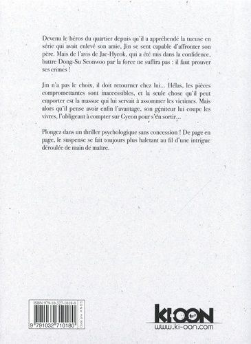Devenu le héros du quartier depuis qu'il a appréhendé la tueuse en série qui avait enlevé son amie, Jin se sent capable d'affronter son père. Mais de l'avis de Jae-Hyeok, qui a été mis dans la confidence, battre Dong-Su Seonwoo par la force ne suffira pas : il faut prouver ses crimes ! Jin n'a pas le choix, il doit retourner chez lui... Hélas, les pièces compromettantes sont inaccessibles, et la seule chose qu'il peut emporter est la massue qui lui seivait à assommer les victimes. Mais alors qu'il pense avoir enfin l'avantage, son géniteur lui coupe les vivres, l'obligeant à compter sur Gyeon pour s'en sortir... Plongez dans un thriller psychologique sans concession ! De page en page, le suspense se fait toujours plus haletant au fil d'une intrigue déroulée de main de maître.