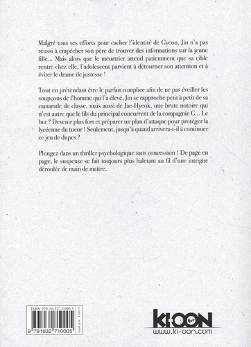 Malgré tous ses efforts pour cacher l'identité de Gyeon, Jin n'a pas réussi à empêcher son père de trouver des informations sur la jeune fille... Mais alors que le meurtrier attend patiemment que sa cible rentre chez elle, l'adolescent parvient à détourner son attention et à éviter le drame de justesse ! Tout en prétendant être le parfait complice afin de ne pas éveiller les soupçons de l'homme qui l'a élevé, Jin se rapproche petit à petit de sa camarade de classe, mais aussi de Jae-Hyeok, une brute notoire qui n'est autre que le fils du principal concurrent de la compagnie G... Le but ? Devenir plus fort et préparer un plan d'attaque pour protéger la lycéenne du tueur ! Seulement, jusqu'à quand arrivera-t-il à continuer ce jeu de dupes ? Plongez dans un thriller psychologique sans concession ! De page en page, le suspense se fait toujours plus haletant au fil d'une intrigue déroulée de main de maître.