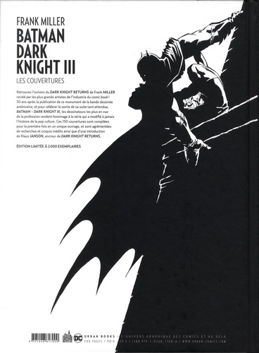 Retrouvez l'univers du DARK KNIGHT RETURNS de Frank MILLER recréé par les plus grands artistes de l'industrie du comic book ! 30 ans après la publication de ce monument de la bande dessinée américaine, et pour célébrer la sortie de sa suite tant attendue, BATMAN -DARK KNIGHT III, les dessinateurs les plus en vue de la profession rendent hommage à la série qui a modifié jamais l'histoire de la pop culture. Ces 150 couvertures sont compilées pour la première fois en un unique ouvrage, et sont agrémentées de recherches et croquis inédits ainsi que d'une introduction de Klaus JANSON, encreur de DARK KNIGHT RETURNS. Edition limitée à 2 000 exemplaires.
