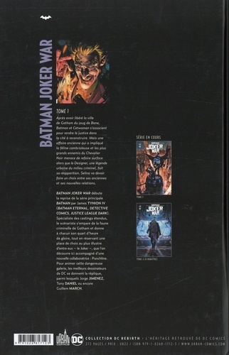 Après avoir libéré la ville de Gotham du joug de Bane, Batman et Catwoman s'associent pour rendre la justice dans la cité à reconstruire. Mais une affaire ancienne qui a impliqué la féline cambrioleuse et les plus grands ennemis du Chevalier Noir menace de refaire surface alors que le Designer, une légende urbaine du milieu criminel, fait sa réapparition. Selina va devoir faire un choix entre ses anciennes et ses nouvelles relations. Batman Joker War débute la reprise de la série principale Batman par James Tynion IV (Batman Eternal, Detective Comics, Justice League Dark). Spécialiste des castings étendus, le scénariste s'empare de la faune criminelle de Gotham et donne a chacun son quart d'heure de gloire, tout en réservant une place de choix au plus illustre d'entre eux — le Joker —, que lion découvre ici accompagné d'une nouvelle collaboratrice : Punchline. Pour animer cette dangereuse galerie, les meilleurs dessinateurs de DC se donnent la réplique, parmi lesquels lorge Jimenez, Tony Daniel ou encore Guillem March.