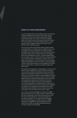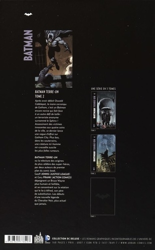 Après avoir défait Oswald Cobblepot, le maire corrompu de Gotham, c'est un Batman encore novice qui fait face à un autre défi de taille : un terroriste anonyme surnommé le Sphinx ! Assassinant des victimes innocentes aux quatre coins de la ville, ce dernier lance une vague d'effroi sur Gotham City. Plus bas, dans les souterrains, une créature mi-homme mi-crocodile suscite les plus folles rumeurs. Batman Terre-Un ou la relecture des origines du plus célèbre des super-héros, par deux auteurs de premier plan du comic book. Geoff Johns (Justice League) et Gary Frank (Action Comics) dépeignent un Bruce Wayne plus humain et faillible, et se concentrent sur la relation qui le lie à Alfred, son père de substitution. Les débuts d'une nouvelle légende du Chevalier Noir, plus actuel que jamais.