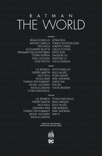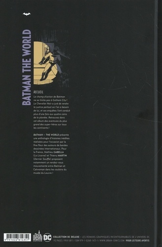 Le champ d'action de Batman ne se limite pas à Gotham City ! Le Chevalier Noire a juré de rendre la justice partout où l'on a besoin de lui, et ses enquêtes l'ont conduit plus d'une fois aux quatre coins de la planète. Retrouvez dans et album des aventures du plus grand des super-héros sur tous les continents ! Batman — The World présente une anthologie d'histoires inédites réalisées pour l'occasion parla fine fleur des auteurs de bandes dessinées internationaux. Pour la France, Mathieu Gabella (La Licorne) et Thierry Martin (Dernier Souffle) proposent notamment un rendez-vous mouvementé entre Batman et Catwoman dans les couloirs du musée du Louvre !