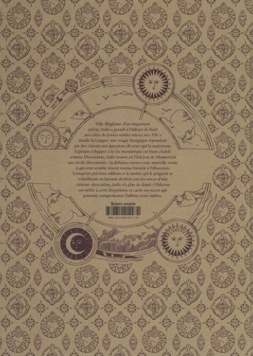 Fille illégitime d'un important prélat, Iodis a grandi à l'abbaye de Réol aux côtés de jeunes nobles mieux nés. Elle y étudie la Langue, une magie liturgique répondant par des visions aux questions de ceux qui la maîtrisent. Espérant échapper à la vie monastique en étant choisie comme Doctorante, Iodis trouve une rivale déterminée en la personne d'Halcyon de Monterréol, une nouvelle venue à qui tout semble réussir et dont les manières fuyantes lui semblent aussitôt suspectes. Lorsqu'un précieux tableau et le moine qui le peignait disparaissent en laissant derrière eux les traces d'une violente altercation, Iodis n'a plus de doute : Halcyon sait quelque chose et cache un secret qui pourrait compromettre l'abbaye tout entière.
