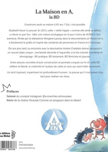 Une BD tuto, décapante, drôle, féministe... Ambre Chatelain et Elizabeth Faure racontent avec humour les étapes de l'auto-construction et la vie d'Elizabeth sur son chantier. Elizabeth Faure l'a prouvé. En 2013, cette "vieille hippie" comme elle aime se définir, a relevé un pari fou : bâtir une maison écologique en A pour moins de 40 000 ? . Son aventure, filmée par la réalisatrice Morgane Launay dans le documentaire La Maison en A, a bouleversé le public et inspiré des centaines de personnes en France et à l'étranger. Dix ans plus tard, sa rencontre avec la dessinatrice Ambre Chatelain donne naissance à un nouvel objet unique : une bande dessinée à l'aquarelle, à la fois tutoriel, manifeste et témoignage : BD pratique, BD testament, BD féministe et joyeuse. Entre astuces concrètes d'auto-construction et portraits croqués sur le vif, cette BD célèbre la liberté, la créativité et l'audace de celles et ceux qui osent bâtir autrement. Un récit inspirant, impertinent et profondément humain : la preuve qu'il n'est jamais trop tard pour réaliser ses rêves.