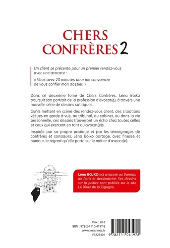 Un client se présente pour un premier rendez-vous avec une avocate : "Vous avez 20 minutes pour me convaincre de vous confier mon dossier. " Dans ce deuxième tome de Chers Confrères, Léna Bojko poursuit son portrait de la profession d'avocat(e), à travers une nouvelle série de dessins satiriques. Qu'ils mettent en scène des rendez-vous client, des situations vécues en garde à vue, au tribunal, au cabinet, ou dans la vie personnelle, ces dessins trouveront un écho chez toutes celles et ceux qui exercent en tant qu'avocat(e)s. Inspirée par sa propre pratique et par les témoignages de confrères et consoeurs, Léna Bojko partage, avec finesse et humour, le regard qu'elle porte sur le métier d'avocat(e).