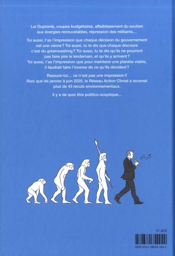 Loi Duplomb, coupes budgétaires, affaiblissement du soutien aux énergies renouvelables, répression des militants... Toi aussi, t'as l'impression que chaque décision du gouvernement est une vanne ? Toi aussi, tu te dis que chaque discours c'est du greenwashing ? Toi aussi, tu te dis qu'ils ne pourront pas faire pire le lendemain, et qu'ils y arrivent ? Toi aussi, t'as l'impression que pour maintenir une planète viable, il faudrait faire l'inverse de ce qu'ils décident ? Rassure-toi... ce n'est pas une impression !! Rien que de janvier à juin 2025, le Réseau Action Climat a recensé plus de 43 reculs environnementaux. Il y a de quoi être politico-sceptique...