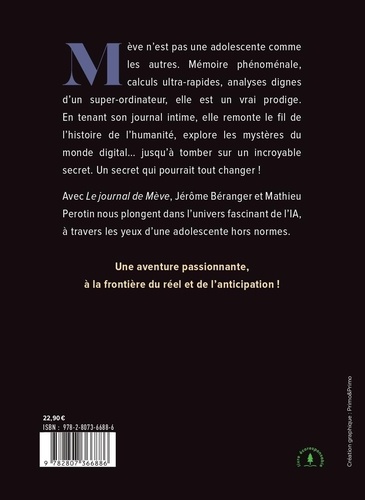 Mève n'est pas une adolescente comme les autres. Mémoire phénoménale, calculs ultra-rapides, analyses dignes d'un super-ordinateur, elle est un vrai prodige. En tenant son journal intime, elle remonte le fil de l'histoire de l'humanité, explore les mystères du monde digital... jusqu'à tomber sur un incroyable secret. Un secret qui pourrait tout changer ! Avec Le journal de Mève, Jérôme Béranger et Mathieu Perotin nous plongent dans l'univers fascinant de l'IA, à travers les yeux d'une adolescente hors normes. Une aventure passionnante, à la frontière du réel et de l'anticipation !