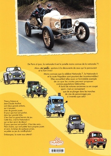 De Paris à Lyon, la nationale 6 est la jumelle moins connue de la nationale 7 ! Alors, en route, partons à la découverte de ceux qui la parcourent et la font vivre ! Moins connues que la célèbre Nationale 7, la Nationale 6 et la route Napoléon sont pourtant des incontournables ! Elles accueillent elles aussi un formidable exemple de ce que les routes peuvent proposer comme populations hétéroclites. A bord de voitures anciennes ou en coupé sport, c'est un ravissement que de se plonger dans les tranches de vies de personnages pas si inventés que cela ! Thierry Dubois et Jean-Claude Amilhat sont deux grands enfants, qui s'amusent avec de grands jouets. Et pour que tout soit parfait, dans leur grande folie, il leur faut un grand terrain de jeu. Cette fois, c'est la Nationale 6 qui va leur servir de décor ! Et pour que tout soit parfait, il faut des amis... Plein d'amis, qui vont prêter leurs propres jouets et venir, le temps de quelques prises, se prêter au jeu du roman-photo ! Embarquez, la route vous attend !