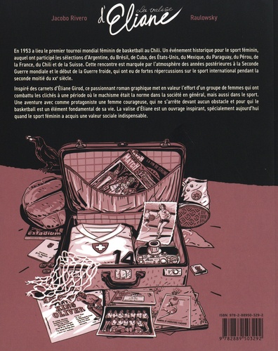 En 1953 a lieu le premier tournoi mondial féminin de basketball au Chili. Un évènement historique pour le sport féminin auquel ont participé les sélections d'Argentine, du Brésil, de Cuba, des Etats-Unis, du Mexique, du Paraguay, du Pérou, de la France, du Chili et de la Suisse. Cette rencontre est marquée par l'atmosphère des années postérieures à la Seconde Guerre Mondiale et le début de la Guerre Froide, qui ont eu de fortes répercussions sur le sport international pendant la seconde moitié du xxe siècle. Inspiré des carnets d'Eliane Girod, ce passionnant roman graphique met en valeur l'effort d'un groupe de femmes qui ont combattu les clichés à une période où le machisme était la norme dans la société en général mais aussi dans le sport. Une aventure avec comme protagoniste une femme courageuse, qui ne s'arrête devant aucun obstacle et pour qui le basketball est un élément fondamental de sa vie. La valise d'Eliane est un ouvrage inspirant, spécialement aujourd'hui quand le sport féminin a acquis une valeur sociale indispensable.