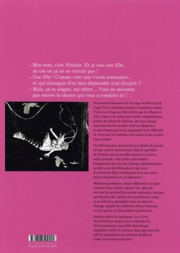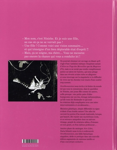 On pourrait résumer cet ouvrage en disant qu'il s'agit d'une variation onirique s'inspirant autant d'Alice au Pays des Merveilles que du Magicien d'Oz, mais ce ne serait pm rendre complètement justice au talent de l'autrice, qui nous plonge dans une rêverie aviaire riche en allégories et nous interroge sur la singularité et la difficulté de vivre sur les chemins tout tracés d'une société trop normée. Ornithamaniacs nous invite à la lisière du monde tel que nous le connaissons, dans le quotidien de Niniche, une jeune fille comme les autres, enfin presque : une petite paire d'ailes bourgeonne sur son dos, étrange métamorphose, qu'elle tente de dissimuler et qui tend les relations déjà compliquées avec une mère interventionniste et envahissante... Mutation génétique, simple difformité ou signe évident d'une double nature ? Ses ailes lui ouvrent les portes d'un monde inattendu, lorsque, par hasard, elle rejoint une mystérieuse école, et se retrouve catapultée dans un univers étrange, peuplé de créatures ailées, d'oiseaux en tout genre, et d'un curieux professeur... Autrice phare du catalogue Aire Libre, Daria Schmitt nous invite à redécouvrir Ornithomaniacs, une fable fantastique singulière, drôle et poétique dans une nouvelle édition augmentée de contenus inédits et d'une couverture exclusive.