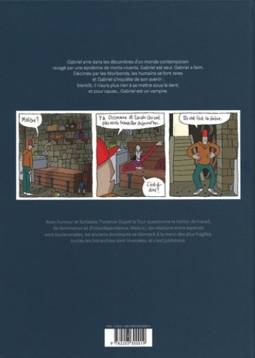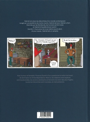 Gabriel erre dans les décombres d'un monde contemporain ravagé par une épidémie de morts-vivants. Gabriel est seul. Gabriel a faim. Décimés par les Moribonds, les humains se font rares et Gabriel s'inquiète de son avenir : bientôt, il n'aura plus rien à se mettre sous la dent, et pour cause... Gabriel est un vampire. Dans cette tragi-comédie de genre, Florence Dupré la Tour questionne la notion de travail, de domination et d'inter-dépendance en utilisant la figure du vampire, traditionnellement assimilée à celle du noble ou du bourgeois, profitant du sang des prolétaires pour survivre. Ici, les relations entre espèces sont bouleversées, les anciens dominants se tiennent à la merci des plus fragiles, toutes les hiérarchies sont inversées, et c'est jubilatoire !