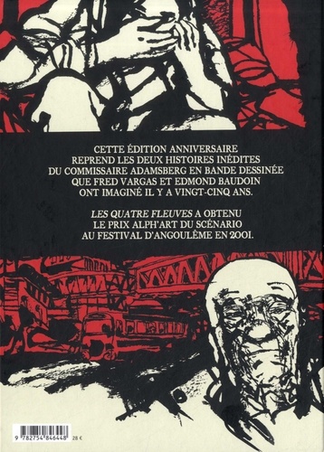 Grégoire Braban et son ami Vincent s'adonnent avec plus ou moins de bonheur au vol à la tire. Ce jour-là, à Saint-Michel, ils arrachent la sacoche d'un vieux. Trente mille balles. Le gros lot. Mais la sacoche est lourde de bien autre chose. Autre chose d'assez dégueulasse. Le sac du vieux, c'est la boîte de Pandore. Il y a tous les péchés du monde là-dedans. Au soir, Vincent est assassiné, la cuisse lacérée de quatre coups de lame. Le commissaire Adamsberg s'inquiète de cet étrange dessin. Le tueur à la serpe, celui que la rumeur a surnommé le Bélier vient-il de signer son quatrième meurtre ? Voici réunies les seules BD signées Fred Vargas, mises en images par Baudoin, qui prête ses traits à Adamsberg avec intensité et justesse. Les Quatre fleuves, paru en 2000 a reçu le prix Alph'Art du scénario à Angoulême en 2001. Voici un tirage unique et limité, une édition spéciale 25 ? anniversaire tirée à 5000 exemplaires, réunissant les deux enquêtes.