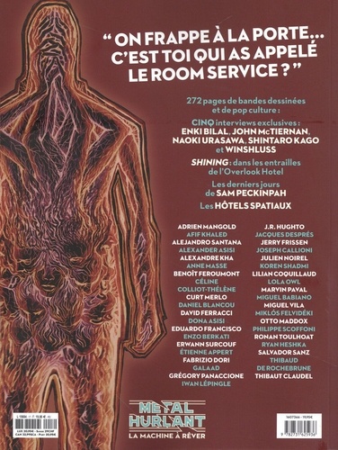 "On frappe a la porte... C'est toi qui as appelé le room service ? " 272 pages de bandes dessinées et de pop culture : Cinq interviews exclusives : Enki Bilal, John McTiernan, Naoki Urasawa, Shintaro Kago et Winshluss. Shining : dans les entrailles de l'Overlook Hotel. Les derniers jours de Sam Peckinpah. Les hôtels spatiaux.