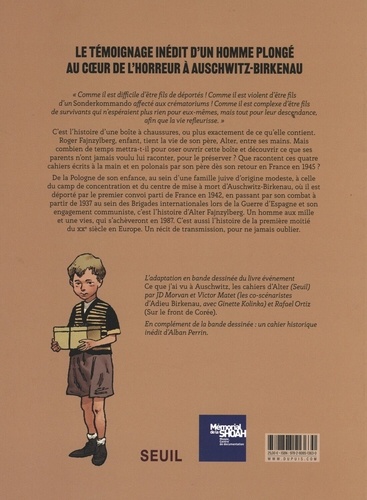 "Comme il est difficile d'être fils de déportés ! Comme il est violent d'être fils d'un Sonderkommando affecté aux crématoriums ! Comme il est complexe d'être fils de survivants qui n'espéraient plus rien pour eux-mêmes, mais tout pour leur descendance, afin que la vie refleurisse." C'est l'histoire d'une boîte à chaussures, ou plus exactement de ce qu'elle contient. Roger Fajnzylberg, enfant, tient la vie de son père, Alter, entre ses mains. Mais combien de temps mettra-t-il pour oser ouvrir cette boîte et découvrir ce que ses parents n'ont jamais voulu lui raconter, pour le préserver ? Que racontent ces quatre cahiers écrits à la main et en polonais par son père dès son retour en France en 1945 ? De la Pologne de son enfance, au sein d'une famille juive d'origine modeste, à celle du camp de concentration et du centre de mise à mort d'Auschwitz-Birkenau, où il est déporté par le premier convoi parti de France en 1942, en passant par son combat à partir de 1937 au sein des Brigades internationales lors de la Guerre d'Espagne et son engagement communiste, c'est l'histoire d'Alter Fajnzylberg. Un homme aux mille et une vies, qui s'achèveront en 1987. C'est aussi l'histoire de la première moitié du XXe siècle en Europe. Un récit de transmission, pour ne jamais oublier. L'adaptation en bande dessinée du livre événement Ce que j'ai vu à Auschwitz, les cahiers d'Alter (Seuil) par JDMorvan et Victor Motet (les co-scénaristes d'Adieu Birkenau, avec Ginette Kolinka) et Rafael Ortiz (Sur le front de Corée). En complément de la bande dessinée : un cahier historique inédit dAlban Perrin.
