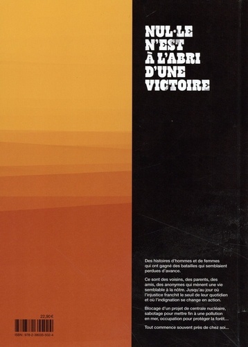 Par Olivier Dubuquoy, le réalisateur du documentaire Irréductibles et le dessinateur Mdeuxpoints I'm fine Introduction : Edgar Morin Préface : Mathieu Vidard Des histoires d'hommes et de femmes qui ont gagné des batailles qui semblaient perdues d'avance - Camargue, Morvan, Corse, Bretagne, Normandie, Larzac, Pays-Basque. Ce sont des voisins, des parents, des amis, des anonymes qui mènent une vie semblable à la nôtre. Jusqu'au jour où l'injustice franchit le seuil de leur quotidien et où l'indignation se change en action. Blocage d'un projet de centrale nucléaire, sabotage pour mettre fin à une pollution en mer, occupation pour protéger la forêt... Tout commence souvent près de chez soi...