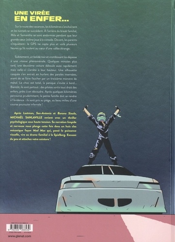 Une virée en Enfer... Les vacances ! Enfin ! Baignades, promenades et rigolades, nous voilà ! Mais avant ça, il reste à surmonter la route et ses kilomètres de bitume. A bord du break Volvo, la famille tue le temps et les parents occupent leurs trois filles comme ils le peuvent. On plaisante, on joue, les paysages défilent et se transforment. Mila et Samantha, les deux plus jeunes, s'endorment rapidement. Jolène, l'aînée, pourrait prendre le volant afin de pratiquer sa conduite accompagnée, mais elle préfère une option plus tranquille : sa console portable. Les tunnels s'enchaînent et l'équipage roule désormais le long d'un lac vert turquoise entouré de falaises abruptes. Une ambiance étrange règne sur cette route. Le GPS a perdu son signal, l'heure du déjeuner approche et, cerise sur le gâteau, Samantha se réveille avec une envie pressante. Subitement, un bolide noir les dépasse à une vitesse phénoménale dans un vacarme assourdissant. La famille est sous le choc, d'autant qu'un deuxième les surprend à nouveau et stoppe à leur hauteur. Une silhouette noire et casquée s'extrait du véhicule en hurlant des paroles insensées. Les trois soeurs sont effrayées par ce chauffard délirant semblant tout droit sorti des enfers. Ils n'en sauront pas davantage, car l'homme, distrait par la famille, se fait faucher par un 3e monstre de métal identique aux deux autres. Après quelques kilomètres parcourus prudemment, les passagers du break Volvo doivent se rendre à l'évidence : ils sont perdus et pris au piège au beau milieu d'une poursuite infernale... Après Lastman, San-Antonio et Banana Sioule, Michaël Sanlaville revient avec un thriller psychologique sous haute tension. Sa narration limpide et nerveuse nous plonge cette fois dans un huis clos mécanique façon Mad Max qui, passé la puissance visuelle, vire au drame familial façon Spielberg. Excusez du peu et attachez votre ceinture !