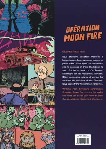 Deux étudiants assistent médusés à l'atterrissage d'une soucoupe volante en pleine forêt. Alors qu'ils se demandent s'ils ne sont pas en train d'halluciner, ils sont témoins du meurtre d'un homme, désintégré par les mystérieux Martiens. Déterminés à être pris au sérieux par les autorités qui leur rient au nez, Charlene, Dave et son frère Vince mènent l'enquête... Véritable récit d'aventure paranoïaque, Opération Moon Fire reprend les codes des récits des sixties pour mieux se jouer d'un complotisme résolument intemporel.