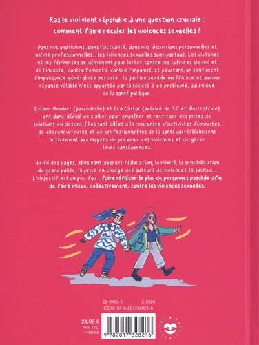 Ras le viol vient répondre à une question cruelle mais réelle : comment faire reculer les violences sexuelles ? Dans nos quotidiens, dans l'actualité, dans nos discussions personnelles et même professionnelles... elles sont partout. Les victimes et les féministes se démènent pour lutter contre la culture du viol et la culture de l'inceste, contre l'omerta, contre l'impunité. Et pourtant, un sentiment d'impuissance généralisée persiste : la justice semble inefficace et aucune réponse valable n'est apportée par la société à ce problème, qui relève de la santé publique. Esther Meunier (journaliste) et Léa Castor (autrice de BD et illustratrice) ont donc décidé de s'allier pour enquêter et restituer des pistes de solutions en dessins. L'objectif un peu fou : faire réfléchir le plus de personnes possibles pour faire mieux, collectivement, contre les violences sexuelles. Au fil des pages, elles vont aborder l'éducation, la mixité, la sensibilisation du grand public avec des activistes féministes diverses, du Planning familial de #NousToutes ou encore du Mwasi Collectif, des chercheurs et chercheuses, et des professionnel·les de santé pour réfléchir aux moyens de prévenir ces violences, de gérer leurs conséquences, d'améliorer la justice et l'accompagnement des victimes. Parce qu'elles sont convaincues qu'il n'y a pas de fatalité, Esther et Léa ont pensé cette BD comme une porte d'entrée vers les questions de société que posent les violences sexuelles ainsi qu'une fenêtre sur l'espoir de les endiguer.