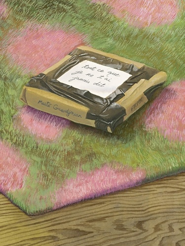 "Ca m'intéresse de mettre des artefacts humains dans des espaces naturels, et inversement une nature qui s'introduit dans les habitations. Ca crée un trouble. En général les humains préfèrent quand ces deux choses sont bien séparées". Récit sur le deuil amoureux, le souvenir et l'absence, Tout ce que je ne t'ai jamais dit est une traversée brûlante de lieux hantés par nos troubles intérieurs. Une méditation tourmentée à la portée universelle, au coeur de notre intimité, qui parvient à évoquer nos relations et nos blessures quasiment sans mots ni personnages. On y navigue entre des paysages aux couleurs vibrantes à l'encre et à la gouache, indiciblement menaçants, et des refuges intranquilles, envahis par une présence extérieure. Sous un ciel dilué, un orage gronde, lourd de tout ce que l'on a pas su nommer ou dire. Chaque image, chaque paysage est une histoire à part entière, tissée d'ambiguïtés, où le calme cache quelque chose. Tout ce que je ne t'ai jamais dit se lit l'imaginaire à vif, flottant dans un réalisme magique aux accents fauves, spectaculaire et troublant. Des objets perdus dans la nature évoquent ce que nous avons laissé en chemin, les maisons où s'infiltrent les éléments disent une intériorité devenue invivable. Mais l'ensemble est inondé d'une chaude lumière, tout part d'un élan vers la clarté. Autour des thèmes centraux évoqués en filigrane gravitent des sujets connexes, comme refoulés mais bien présents, grâce à la polysémie d'images virtuoses. Marquée par Lynch ou Alex Barbier, la voix de Maïté Grandjouan est unique par sa puissance évocatrice et narrative. L'éclat de couleurs quasi surnaturelles, l'atmosphère fantastique rendue palpable par le travail des textures, le silence obstiné créent un récit trouble, habité par nos peurs profondes, nos souvenirs maudits... Ses rares personnages sont des reflets ou des mirages, voués à laisser la place au paysage. A nous de projeter nos intuitions dans le champ qui nous est laissé, d'habiter les lieux, de nous perdre, de renouer avec nos peurs et avec ce qui nous rassure.
