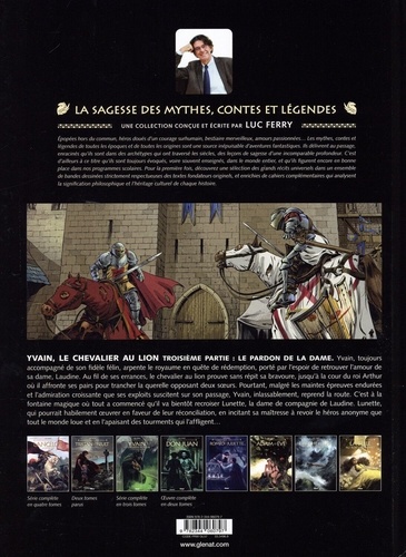 Epopées hors du commun, héros doués d'un Courage surhumain, bestiaire merveilleux, amours passionnées... Les mythes, contes et légendes de toutes les époques et de toutes les origines sont une source inépuisable d'aventures fantastiques. Il délivrent au passage, enracinés qu'ils sont dans des archétypes qui ont traversé les siècles, des leçons de sagesse d'une incomparable profondeur. C'est d'ailleurs à ce titre qu'ils sont toujours évoqués, voire souvent enseignés, dans le monde entier, et qu'ils figurent encore en banne place dans nos programmes scolaires. Pour la première fois, découvrez une sélection des grands récits universels dans un ensemble de bandes dessinées strictement respectueuses des textes fondateurs originels, et enrichies de cahiers complémentaires qui analysent la signification philosophique et l'héritage culturel de chaque histoire. Yvain, le chevalier au lion troisième partie : Le pardon de la dame. Yvain, toujours accompagné de son fidèle félin, arpente le royaume en quête de rédemption, porté par l'espoir de retrouver l'amour de sa dame, Laudine. Au fil de ses errances, le chevalier au lion prouve sans répit sa bravoure, jusqu'à la cour du roi Arthur où il affronte ses pairs pour trancher la querelle opposant deux soeurs. Pourtant, malgré les maintes épreuves endurées et l'admiration croissante que ses exploits suscitent sur son passage, Yvain, inlassablement, reprend la route. C'est à la fontaine magique où tout a commencé qu'il va bientôt recroiser Lunette, la dame de compagnie de Laudine. Lunette, qui pourrait habilement oeuvrer en faveur de leur réconciliation, en incitant sa maîtresse à revoir le héros anonyme que tout le monde loue et en l'apaisant des tourments qui l'affligent...