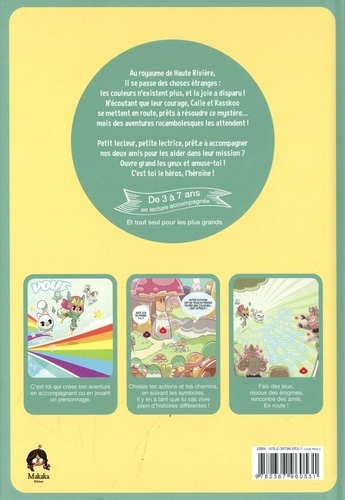 Au royaume de Haute Rivière, il se passe des choses étranges : les couleurs n'existent plus, et la joie a disparu ! N'écoutant que leur courage, Calie et Kasskoo se mettent en route, prêts à résoudre ce mystère... mais des aventures rocambolesques les attendent ! Petit lecteur, petite lectrice, prêt.e à accompagner nos deux amis pour les aider dans leur mission ? Ouvre grand les yeux et amuse-toi ! C'est toi le héros, l'héroïne !
