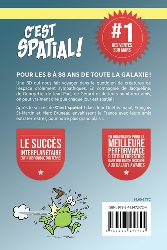 Pour les 8 à 88 ans de toute la galaxie ! Une BD qui nous fait voyager dans le quotidien de créatures de l'espace drôlement sympathiques. En compagnie de Jacqueline, de Georgette, de Jean-Paul, de Gérard et de leurs nombreux amis, on peut vraiment dire que chaque jour est spatial ! Après le succès de C'est spatial ! dans leur Québec natal, François St-Martin et Marc Bruneau envahissent la France avec leurs amis extraterrestres, pour notre plus grand plaisir.