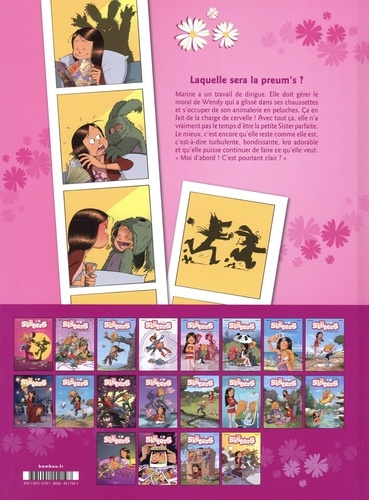 Laquelle sera la preum's ? Marine a un travail de dingue. Elle doit gérer le moral de Wendy qui a glissé dans ses chaussettes et s'occuper de son animalerie en peluches. Ca en fait de la charge de cervelle ! Avec tout ça, elle n'a vraiment pas le temps d'être la petite Sister parfaite. Le mieux, c'est encore qu'elle reste comme elle est, c'est-à-dire turbulente, bondissante, kro adorable et qu'elle puisse continuer de faire ce qu'elle veut. " Moi d'abord ! C'est pourtant clair ? "