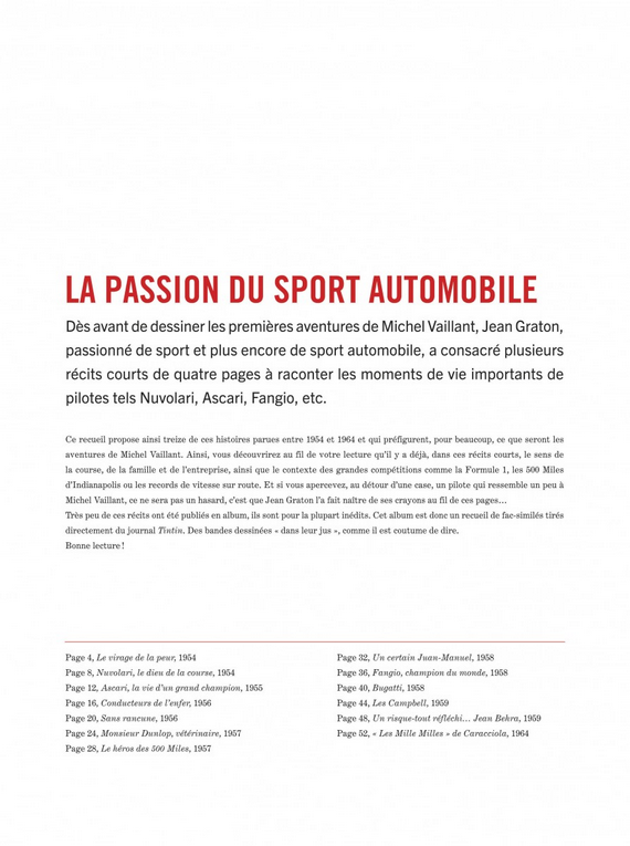 Plongez dans une série d'histoires courtes certifiées sans Michel Vaillant mais avec tout le talent de Jean Graton ! Initialement parues dans le journal Tintin dans les années 1950 et 1960, ces madeleines à moteur aux titres aussi délicieusement évocateurs que Le virage de la peur ou Le héros des 500 Miles vous transporteront dans le monde du sport automobile vintage. Autant de récits constituant, à leur manière, les véritables prémices de la série culte que deviendra vite . Michel Vaillant !