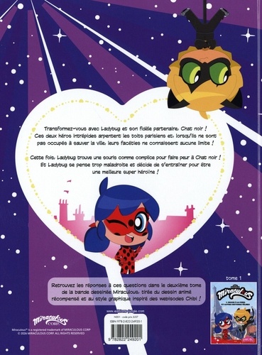Miraculous : le dessin animé préféré des enfants adapté en BD, version chibi Transformez-vous avec Ladybug et son fidèle partenaire, Chat noir ! Ces deux héros intrépides arpentent les toits parisiens et, lorsqu'ils ne sont pas occupés à sauver la ville, leurs facéties ne connaissent aucune limite ! Cette fois, Ladybug trouve une souris comme complice pour faire peur à Chat noir ! Et Ladybug se pense trop maladroite et décide de s'entraîner pour être une meilleure super héroïne !