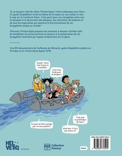 Alors les enfants... Vous venez ? Destination : l'Antarctique ! Marc, guide d'expédition en Antarctique, invite tous les élèves de la classe sur son zodiac ! C'est parti pour une navigation entre eaux et banquise à la découverte des phoques, des manchots, des baleines et de tous les organismes qui assurent le fonctionnement de cet écosystème unique au monde ! Entre BD et documentaire, Direction l'Antarctique propose une aventure à hauteur d'enfant afin de sensibiliser les jeunes lectrices et lecteurs à la préservation de cet écosystème étonnant qui repose entièrement sur la glace.