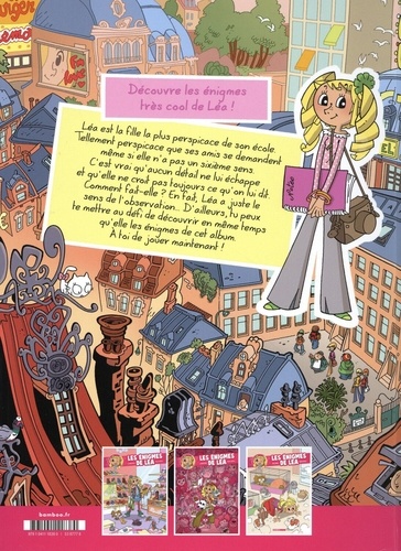 Léa est la fille la plus perspicace de son école. Tellement perspicace que ses amis se demandent même si elle n ? a pas un sixième sens. C ? est vrai qu ? aucun détail ne lui échappe et qu ? elle ne croit pas toujours ce qu ? on lui dit. Comment fait-elle ? En fait, Léa a juste le sens de l ? observation ? d ? ailleurs, tu peux te mettre au défi de découvrir en même temps qu ? elle les énigmes de cet album. A toi de jouer maintenant !