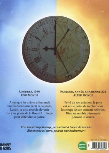 Londres, 1940 Ego Monde. Alors que les avions allemands bombardent sans répit la capitale, Lucan, 14 ans, rêve de devenir un jour pilote de la Royal Air Force pour défendre sa patrie. Roslend, Année Khazienne 326 Alter Monde. Privé de son aviation, le pays est sur le point de tomber sous les coups de son ennemi nelbrien. Rien ne semble désormais pouvoir le sauver. Et si une étrange horloge, permettant à Lucan de basculer d'un monde à l'autre, pouvait tout bouleverser ?