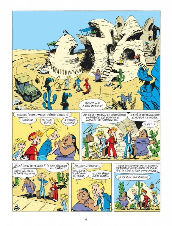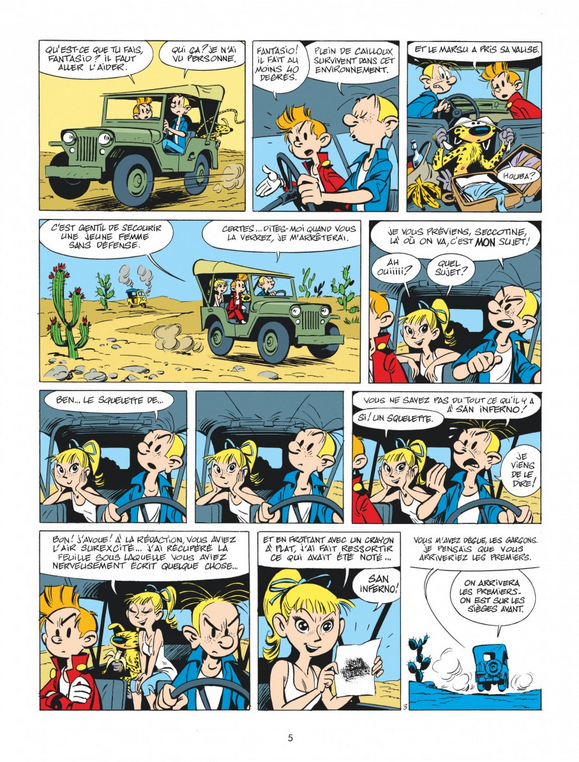 Fantasio ayant encore flairé un nouveau scoop, voilà nos deux compères en route pour San Inferno, village isolé d'Amérique centrale. Et une fois n'est pas coutume, Seccotine ne tarde pas à pointer le bout de son nez... Mais dès leur arrivée, rien ne se passe comme prévu : un homme au sombrero sombre, Rodrigo, leur enjoint de partir, menaçant. Les voilà prévenus. Dans les catacombes, la femme du maire les conduit à sa découverte : un squelette qu'elle pense être celui d'un extraterrestre. Plus étrange encore, à son cou, est accroché un médaillon sur lequel figure un drôle de plan à décrypter... Auteur s'étant déjà attelé à de nombreux genres en bande dessinée, Lewis Trondheim relève pour la première fois le défi d'écrire le scénario d'un Spirou qui s'avère jouer à merveille avec les codes de la série mythique. A ses côtés, Fabrice Tarrin, qui avait déjà signé Spirou chez les Soviets avec Fred Neidhardt, continue de s'inscrire par son dessin dans la continuité de Franquin.