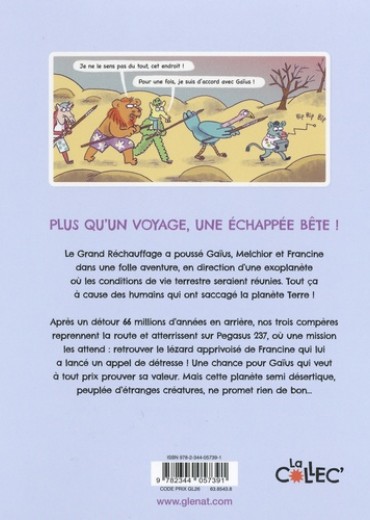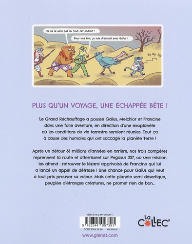 Plus qu'un voyage, c'est une échappée bête ! Le Grand Réchauffage a poussé nos trois héros dans une folle aventure à travers l'espace, à la recherche de l'exoplanète Proxima B qui réunit les conditions de vie terrestre. Après un détour à l'époque des dinosaures, les trois amis reviennent à notre époque et atterrissent sur Pegasus 237, une planète habitée par d'étranges créatures qui pourront peut-être leur révéler où est retenu le lézard apprivoisé de Francine. Tout un programme ! Ce tome 3 boucle en beauté les aventures de Gaïus, Francine et Melchior.