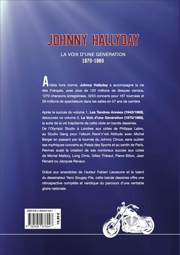 Artiste hors norme, Johnny Hallyday a accompagné la vie des Français, avec plus de 120 millions de disques vendus, 1270 chansons enregistrées, 3253 concerts pour 187 tournées et 29 millions de spectateurs dans les salles en 57 ans de carrière. Après le succès du volume 1, Les Tendres Années (1943/1969), découvrez ce volume 2, La Voix d'une Génération (1970/1985), la suite de la vie trépidante de cette idole en bande dessinée. De l'Olympic Studio à Londres aux côtés de Philippe Labro, au Studio Gang pour l'album Rock'n'roll Attitude avec Michel Berger en passant par la tournée du Johnny Circus, sans oublier ses mythiques concerts au Palais des Sports et au zénith de Paris. Revivez aussi la création de ses nombreux succès aux côtés de Michel Mallory, Long Chris, Gilles Thibaut, Pierre Billon, Jean Renard ou Jacques Revaux. Grâce aux anecdotes de l'auteur Fabien Lecoeuvre et le talent du dessinateur Yann Sougey-Fils, cette bande dessinée offre une rétrospective complète et véridique du parcours d'une véritable gloire nationale.