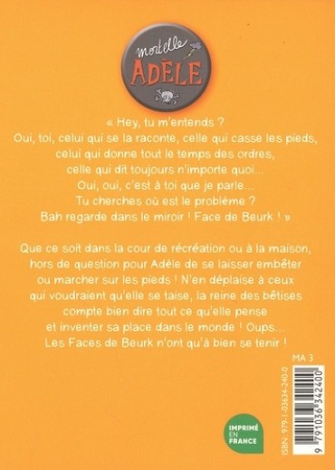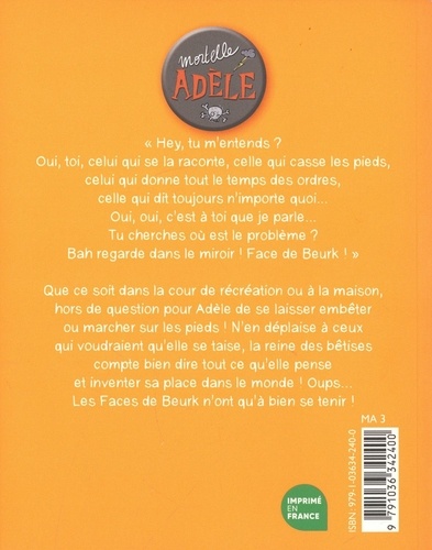 "Hey, tu m'entends ? Oui, toi, celui qui se la raconte, celle qui casse les pieds, celui qui donne tout le temps des ordres, celle qui dit toujours n'importe quoi... Oui, oui, c'est à toi que je parle... Tu cherches où est le problème ? Bah regarde dans le miroir ! Face de Beurk ! " Que ce soit dans la cour de récréation ou à la maison, hors de question pour Adèle de se laisser embêter ou marcher sur les pieds ! N'en déplaise à ceux qui voudraient qu'elle se taise, la reine des bêtises compte bien dire tout ce qu'elle pense et inventer sa place dans le monde ! Oups... Les faces de Beurk n'ont qu'à bien se tenir ! © Mr Tan et Diane Le Feyer d'après l'oeuvre créée par Mr Tan et Miss Prickly