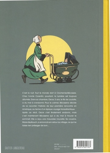 C'est la nuit. Tout le monde dort à Clocher-les-Bécasses. Chez l'oncle Corentin, pourtant, la lumière est toujours allumée. Dans sa chambre, Oscar, 5 ans, le fils de Loulotte, a du mal à s'endormir. Pour le calmer, Bécassine décide de lui raconter l'histoire de leur première rencontre en Amérique, au terme d'un épique voyage transatlantique. Après ce récit, Oscar s'est finalement endormi, mais c'est maintenant Bécassine qui a du mal à trouver le sommeil. Elle a reçu une mauvaise nouvelle. Sa cousine, Marie Quillouch, a annoncé son retour au village, ce qui ne laisse rien présager de bon...