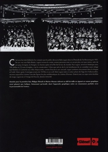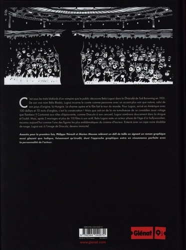 Un Dracula plus vrai que nature : retour sur une légende de l'âge d'or Hollywoodien. C'est sous les traits blafards d'un vampire que le public découvre Bela Lugosi dans le film de Tod Browning en 1931. De son vrai nom Béla Blaskó, Lugosi incarne le comte Dracula comme personne avec un accent plus vrai que nature, celui de son pays d'origine, la Hongrie. Le charme opère et le film fait le tour du monde. Pour Lugosi, arrivé en Amérique avec 100 dollars et 10 mots d'anglais, c'est la consécration ! Mais que sait-on de la vie tumultueuse de ce comédien aussi volage que flambeur ? Né en 1882, Lugosi connaît le dénuement et la guerre avant que son charisme ne lui ouvre les portes du théâtre. Quand le communisme s'effondre en 1919 il est obligé de fuir : ce sera Vienne, puis Berlin et enfin les Etats Unis ! Les débuts sont difficiles mais en 1927 Lugosi a rendez-vous avec son destin : il monte sur les planches à Broadway pour jouer... Dracula ! Ce rôle lui colle à la peau, les spectateurs en tremblent. Pourtant, cette reconnaissance internationale le vampirise. C'est peut-être pour cela qu'il refusera de jouer encore une fois une créature... Frankenstein. Erreur, le film est un triomphe. Cantonné aux rôles d'épouvante, comme Dracula à son cercueil, Lugosi sombre doucement dans la drogue et en est réduit à tourner en fin de carrière avec Ed Wood, considéré comme le plus mauvais cinéaste de l'Histoire ! Sa vie sentimentale complexe ne lui sera d'aucun secours même si sa dernière épouse l'accompagnera jusqu'à sa mort en 1956. Après cinq mariages et plus de 110 films à son actif, Bela Lugosi reste un acteur phare de l'âge d'or Hollywoodien et l'une des figures les plus emblématiques du cinéma d'horreur. Enterré avec sa cape noire doublée de rouge, Lugosi entre dans la légende du 7e art. Immortel à l'image de Dracula, il sera à l'origine de folles rumeurs liées encore et toujours, à son personnage mythique. Philippe Thirault et Marion Mousse, associés pour la première fois, relèvent un défi de taille en signant un roman graphique de plus de 135 pages pour une lecture aussi glaçante que ludique, usant d'un noir et blanc parfaitement maîtrisé. Une belle performance.