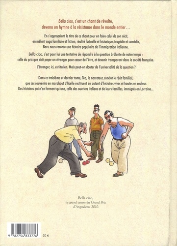 Bella ciao, c'est un chant de révolte, devenu un hymne à la résistance dans le monde entier... En s'appropriant le titre de ce chant pour en faire celui de son récit, en mêlant saga familiale et fiction, réalité factuelle et historique, tragédie et comédie, Baru nous raconte une histoire populaire de l'immigration italienne. Bella ciao, c'est pour lui une tentative de répondre à la question brûlante de notre temps : celle du prix que doit payer un étranger pour cesser de l'être, et devenir transparent dans la société française. L'étranger, ici, est italien. Mais peut-on douter de l'universalité de la question ? Dans troizième tome, Teo, le narrateur, poursuit le récit familial, que ses souvenirs en marabout d'ficelle restituent en autant d'histoires vives et hautes en couleur, tragiques ou comiques. Celle de sa grande frousse quand il allait porter la gamelle à son père au pied des hauts fourneaux, dans le vacarme assourdissant des tuyères et la chaleur étouffante de la coulée. Celle de la "morra", sans doute le jeu de mains le plus vieux du monde, qui se joue à deux et qui, immanquablement, se termine en castagne ! Celle de Domenico, le grand-père de Teo, qui pouvait passer de longs moments, assis sur sa chaise, à contempler l'eau du robinet couler dans l'évier. Celle encore où il est question des garibaldiens de l'Argonne et d'un certain Lazzaro Ponticelli, devenu Lazare après sa naturalisation en 1939, qui fut pendant quelques mois le dernier poilu de 14-18 encore vivant et, à ce titre, reçut l'hommage de la Nation !
