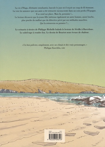 La vie d'Hugo, dilettante estudiantin, bascule le jour où il reçoit un coup de fil étonnant. La voix lui annonce que son amie a été retrouvée inconsciente dans un coin perdu d'Espagne. Il se rend sur place. Mais là, personne ! ... Le lecteur découvre que la jeune fille intéresse également un autre homme, assez louche, plus proche du malfrat que du détective privé par ses méthodes musclées. Qui la retrouvera en premier ? ... Le scénario à tiroirs de Philippe Richelle balade le lecteur de Séville à Barcelone. Le soleil tape à rendre fou. Le dessin de Beuriot nous écrase de chaleur.