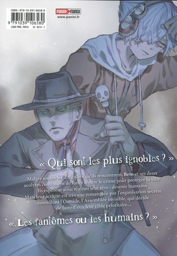 " Qui sont les plus ignobles ? Les monstres ou les humains ? " Même s'ils ont souvent croisé des individus qui ont cherché à les tromper ou à leur faire du tort, Bem et ses deux acolytes, continuent de sauver la ville de ses crimes afin de réaliser leur rêve : devenir humains. Cependant, leur activité est remarquée par l'organisation secrète contrôlant l'Outside : l'Assemblée invisible, qui décide de faire du trio leur cible prioritaire... Panini Manga présente le remake du chef-d'oeuvre BEM, l'homme fantôme, une oeuvre controversée, mettant en scène la cruauté de l'homme à travers l'histoire de trois fantômes. Mosae Nohara signe ici la troisième et plus récente adaptation en manga de l'anime sorti au Japon en 1968, adapté en 2006 puis en 2019.