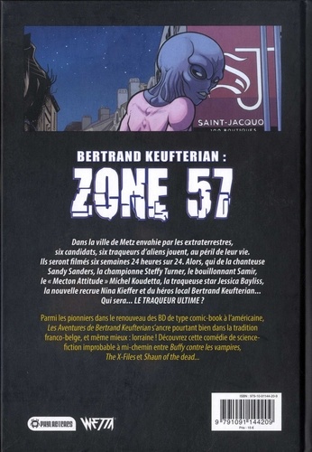 Dans la ville de Metz envahie par les extraterrestres, six candidats, six traqueurs d'aliens jouent, au péril de leur vie. Ils seront filmés six semaines 24 heures sur 24. Alors, qui de la chanteuse Sandy Sanders, la championne Steffy Turner, le bouillonnant Samir, le "Mecton Attitude" Michel Koudetta, la traqueuse star Jessica Bayliss, la nouvelle recrue Nina Kieffer et du héros local Bertrand Keufterian... Qui sera... LE TRAQUEUR ULTIME ? Parmi les pionniers dans le renouveau des BD de type comic-book à l'américaine, Les Aventures de Bertrand Keufterian s'ancre pourtant bien dans la tradition franco-belge, et même mieux : lorraine ! Découvrez cette comédie de science- fiction improbable à mi-chemin entre Buffy contre les vampires, The X-Files et Shaun of the dead...