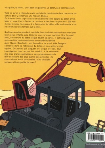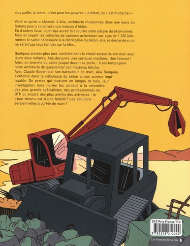 Béton, la fin d'une ère ? " La paille, la terre... c'est pour les pauvres. Le béton, ça c'est moderne ! " Voilà ce qu'on a répondu à Alia Bengana, architecte franco-algérienne missionnée dans une oasis du Sahara pour y construire une maison d'hôtes. En d'autres lieux, la phrase aurait fait sourire cette grande adepte du béton armé. Mais en voyant les cohortes de camions acheminer sur plus de 1200 kilomètres le sable nécessaire à la fabrication du béton, elle se demande si les architectes et l'industrie du bâtiment ne sont pas tombés sur la tête... Quelques années plus tard, près de leur chalet suisse où ils sont confinés avec leurs deux enfants, Alia et Claude découvrent une curieuse machine. Une foreuse ! Ainsi, on cherche du sable dans la région ? Un détail qui remet le sujet sur le tapis : il est temps pour notre architecte de questionner son matériau fétiche. Avec Claude, son baroudeur de mari, et l'appui de leur ami rédacteur en chef d'un magazine suisse, Alia s'enfonce dans la nébuleuse du béton et son univers impitoyable...