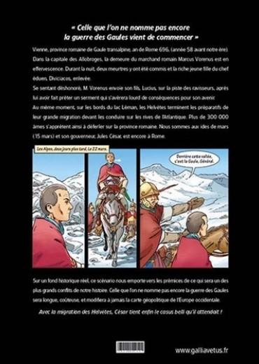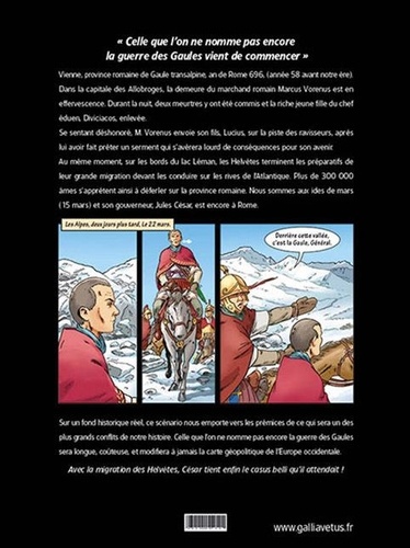 Celle que l'on nomme pas encore la guerre des Gaules, va commencer ! Vienne, 58 a. J. -C. Dans la capitale des Gaulois Allobroges, la demeure de M. Vorenus, un riche marchand romain, est en effervescence. Durant la nuit, deux meurtres ont été commis et la jeune et riche fille du chef éduen Diviciacos, enlevée. Déshonoré, Vorenus envoi son fils, Lucius, sur la piste des ravisseurs, après avoir fait prêter au jeune homme un serment qui s'avèrera lourd de conséquences pour son avenir. Pendant ce temps, sur les bords du lac Léman, les Helvètes terminent les préparatifs de leur grande migration. Plus de 300 000 personnes s'apprêtent à déferler sur la province romaine. Nous sommes le 15 mars et le gouverneur de la province, Jules César, est encore à Rome.