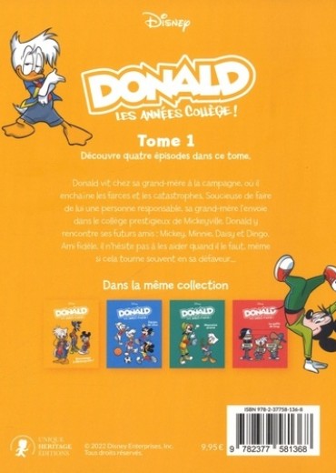 Découvre quatre épisodes dans ce tome. Donald vit chez sa grand-mère à la campagne, où il enchaîne les farces et les catastrophes. Soucieuse de faire de lui une personne responsable, sa grand-mère l'envoie dans le collège prestigieux de Mickeyville. Donald y rencontre ses futurs amis : Mickey, Minnie, Daisy et Dingo. Ami fidèle, il n'hésite pas à les aider quand il le faut. mème si cela tourne souvent en sa défaveur...